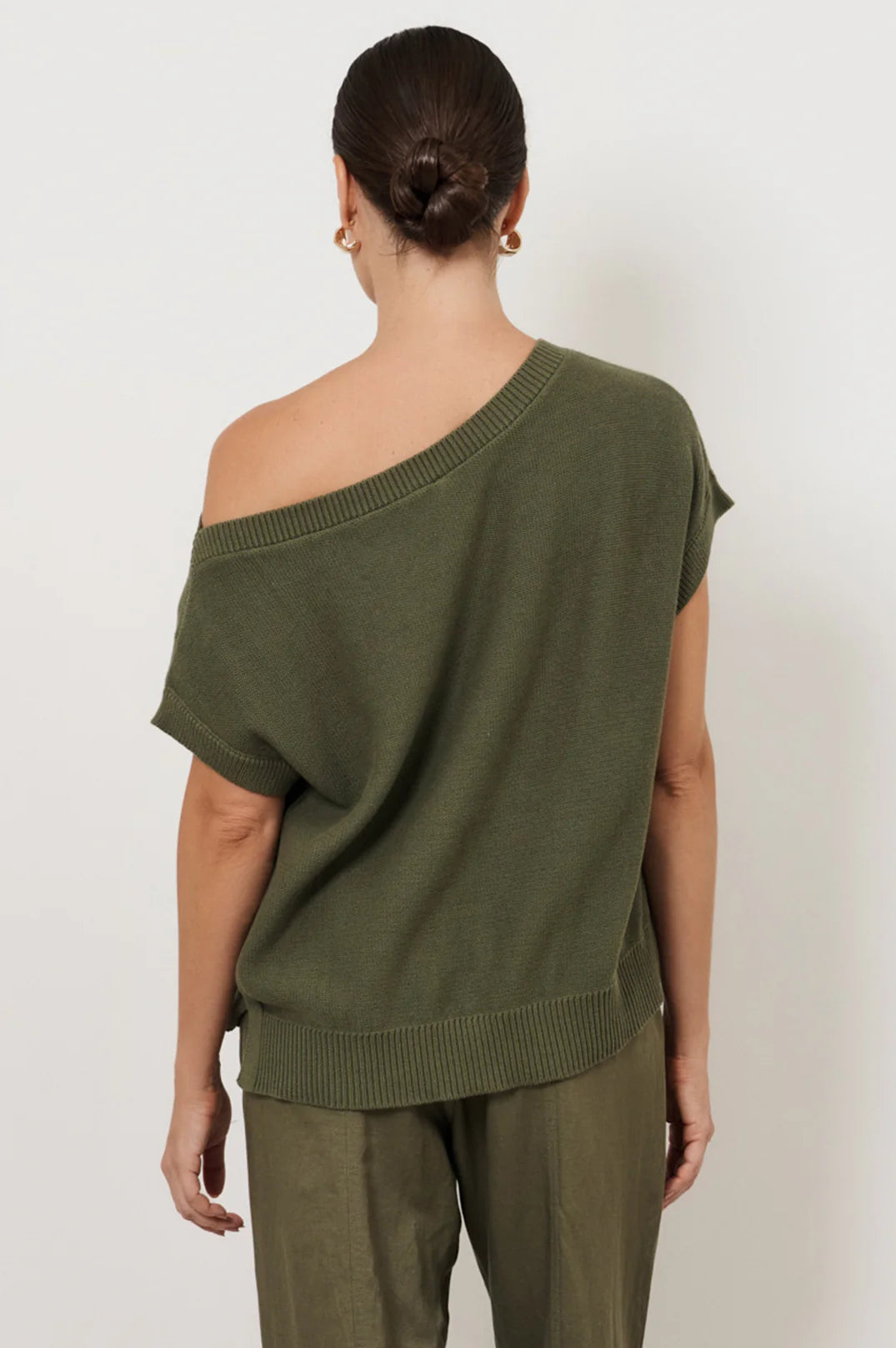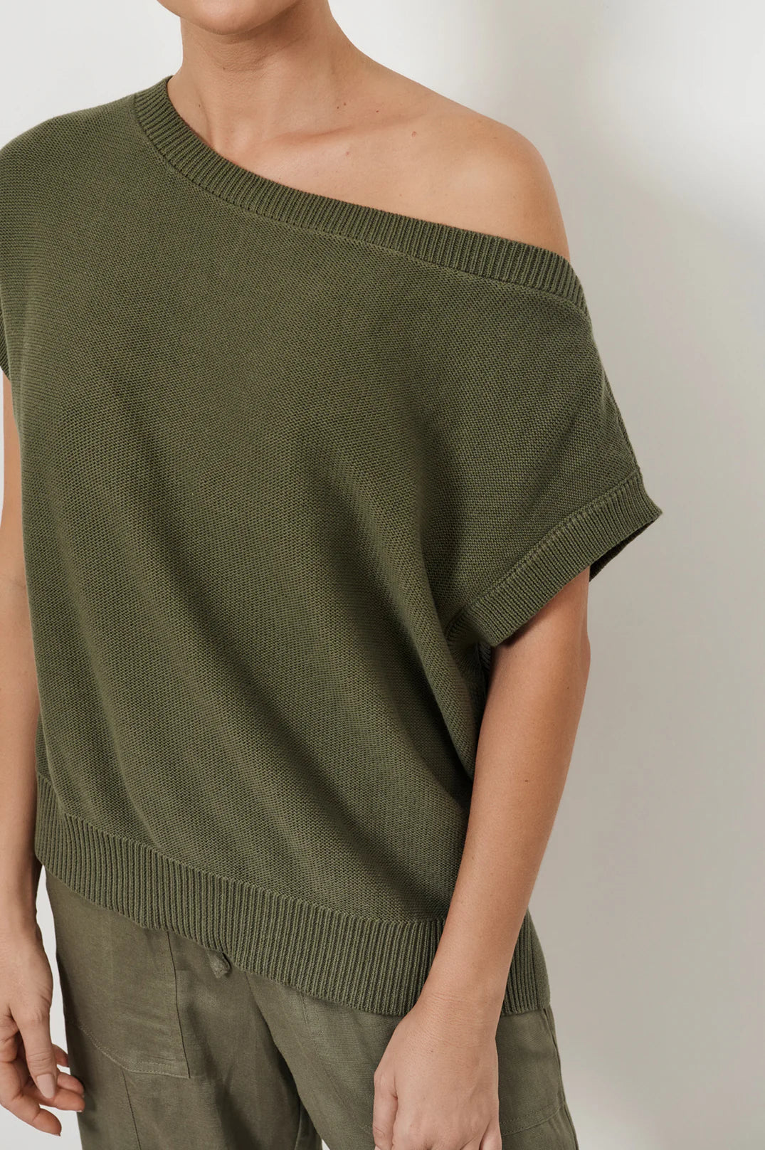 The Terrie Angled Neckline Cotton Knit Top in Khaki is cafted from 100% cotton in a relaxed silhouette. Designed with an angled boat neckline and ribbed trims, it’s an easy, medium-lightweight layer for everyday wear.