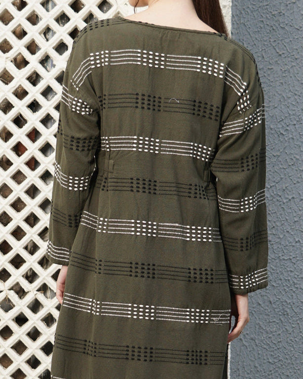 Embrace the winter season with grace and elegance in the Rhiannon Cotton Dress. Made with soft cotton, this beautiful garment features long sleeves for extra warmth, a versatile round neckline, and flattering elasticated inserts at the waist for a defined silhouette. With stylish stitched details, the Rhiannon Dress effortlessly transitions your style from day to evening.