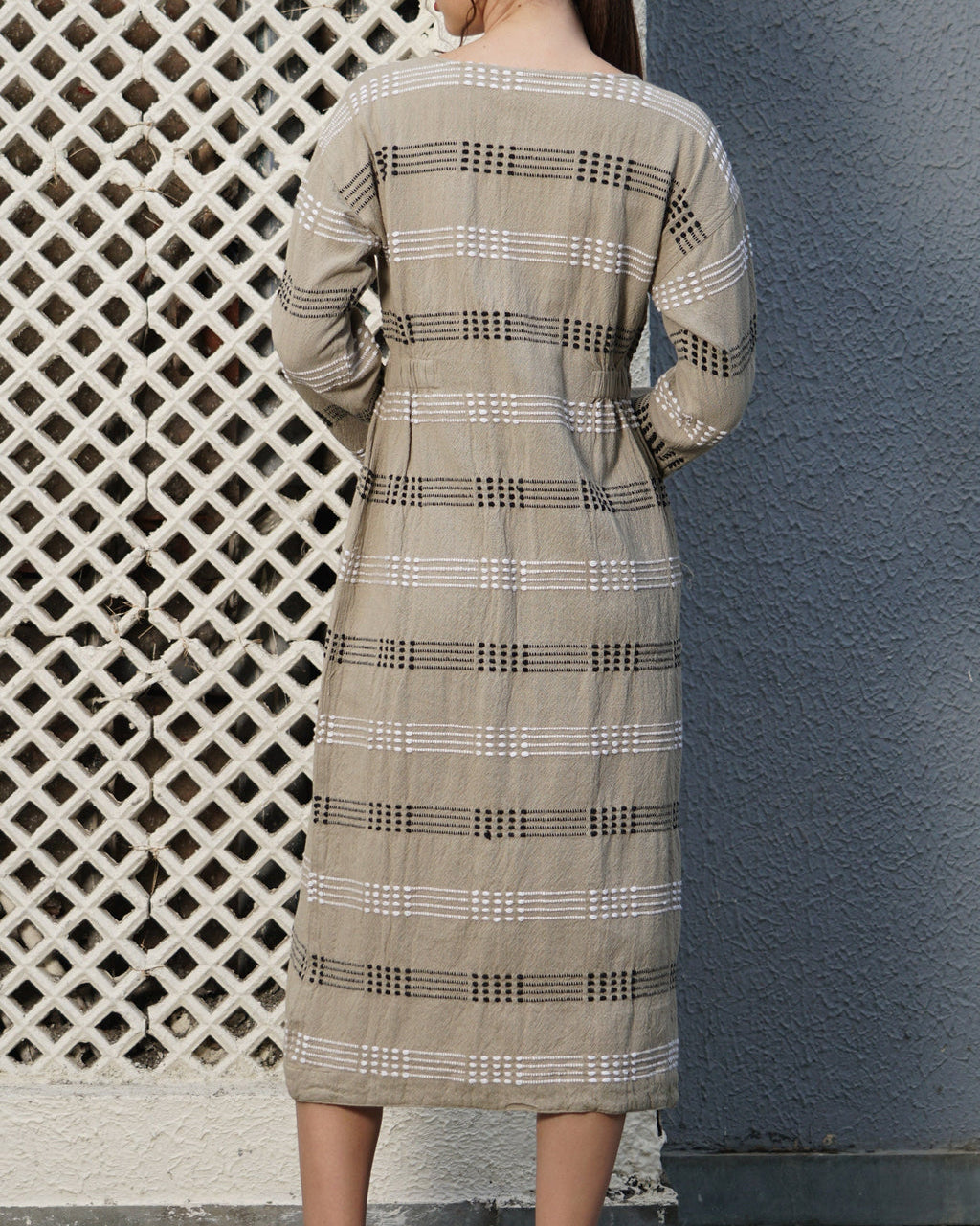 Embrace the winter season with grace and elegance in the Rhiannon Cotton Dress. Made with soft cotton, this beautiful garment features long sleeves for extra warmth, a versatile round neckline, and flattering elasticated inserts at the waist for a defined silhouette. With stylish stitched details, the Rhiannon Dress effortlessly transitions your style from day to evening.