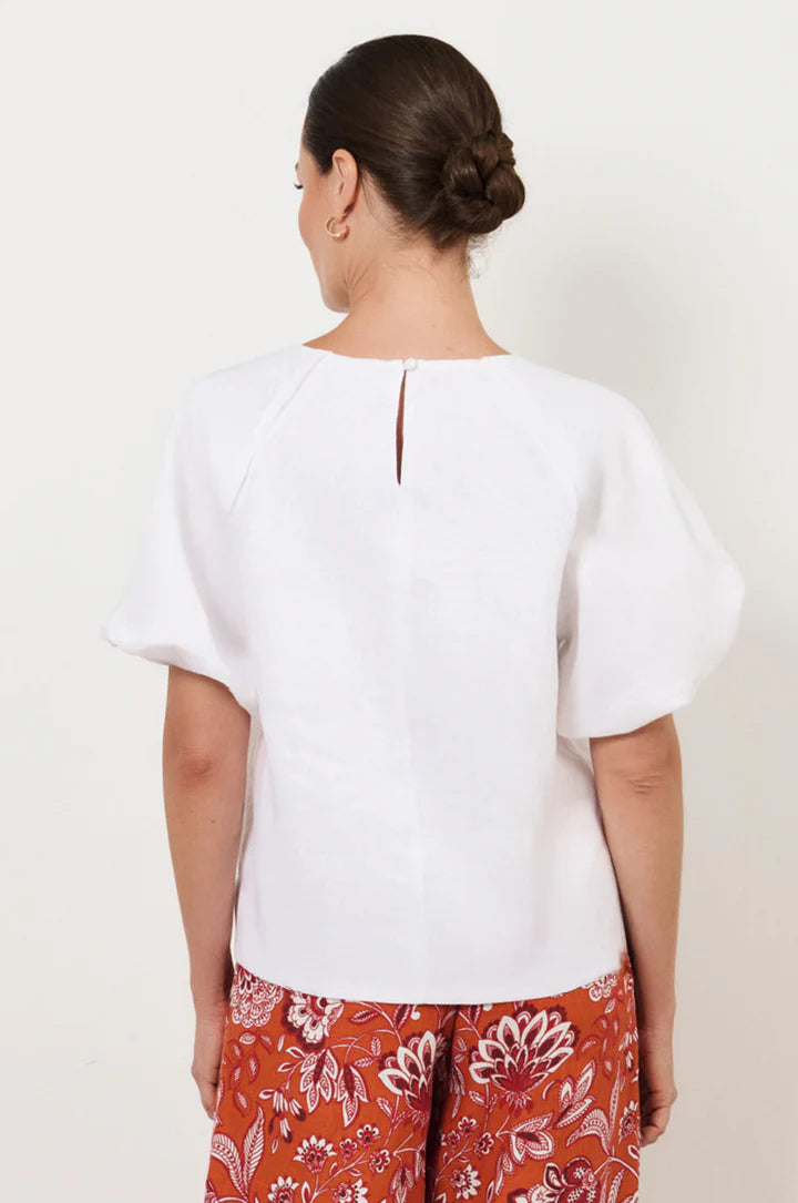 The Santori Short Sleeve Top in White is crafted from 100% linen. Featuring a round neckline and puff sleeves with elasticated cuffs, it’s detailed with subtle piping and finished with a button-and-loop back closure.