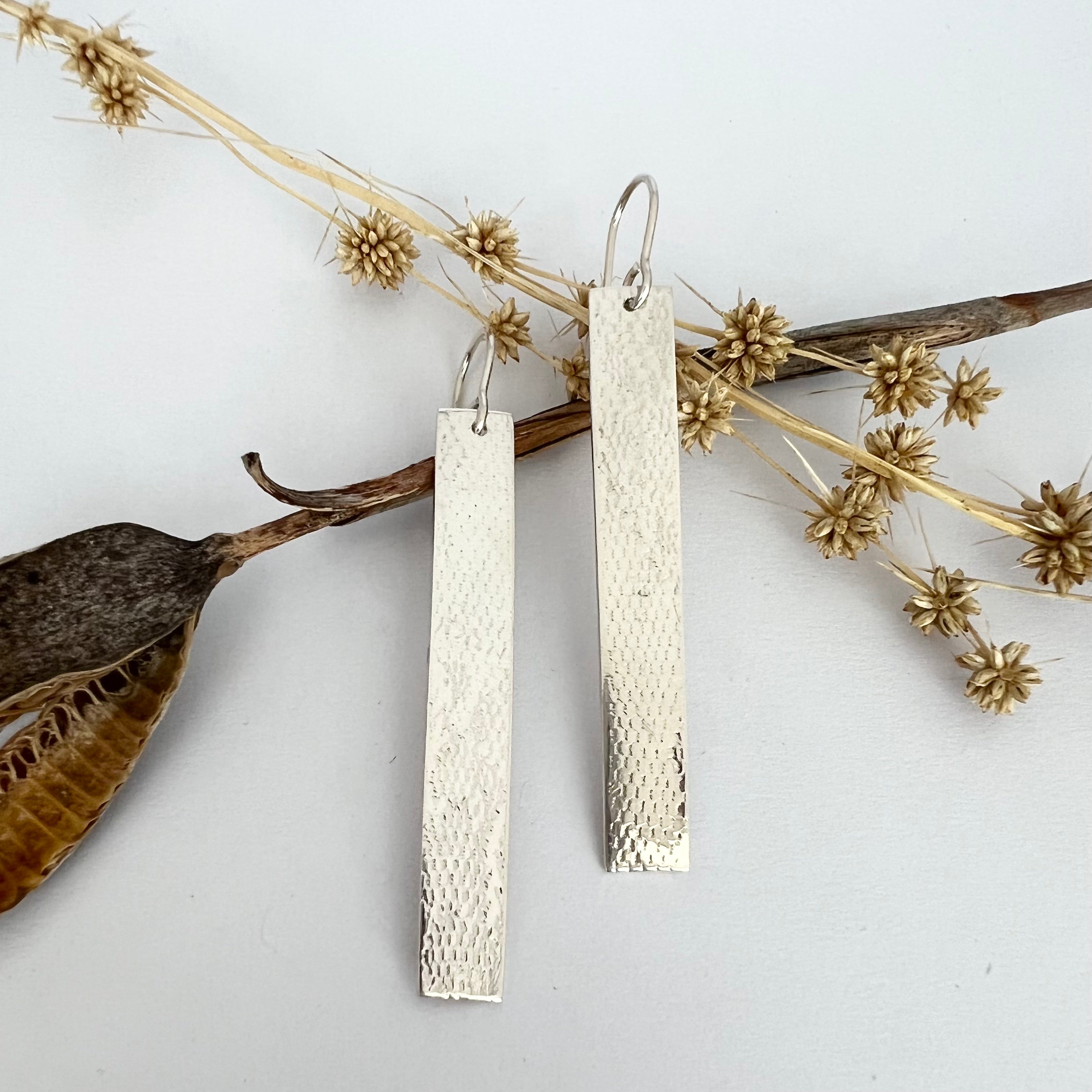 These earrings are incredibly flattering, lengthening the neck and catching the light at every turn. The long bar has slight movement but hangs in a balanced way due to the quality thickness of the silver. Like many of Tania Mallow's other pieces these earrings are created with comfort and quality at the forefront.